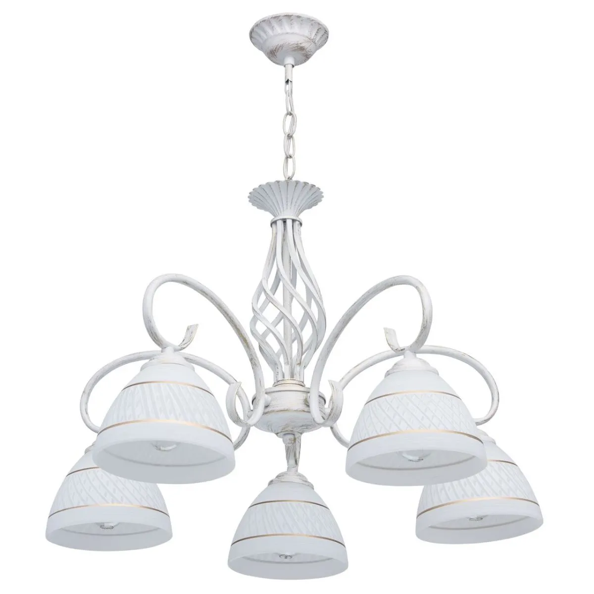 Металлическое основание, окрашенное в белый цвет с золотистой патиной . Плафоны из стекла, отлитого