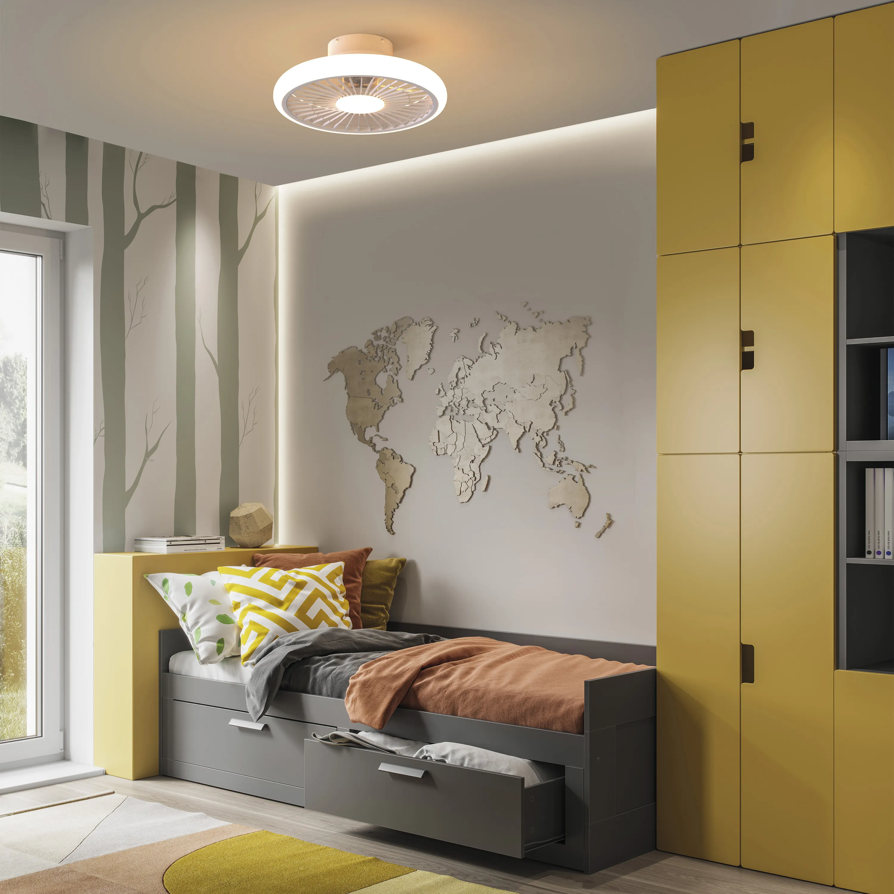 коллекция идеально подходит для спален, благодаря своему тихому, но эффективному двигателю. Вентилятор мощностью 30 Вт установлен за сеткой с замысловатым узором, напоминающим рисунок автомобильного диска . Благодаря возможности TURBO устанавливать различные интенсивности света и вентиляции, он может быть размещен в больших помещениях, таких как гостиная или офис, кухня или игровая зона. Настройки, такие как цветовая температура и скорости двигателя, могут быть изменены с помощью пульта дистанционного управления.