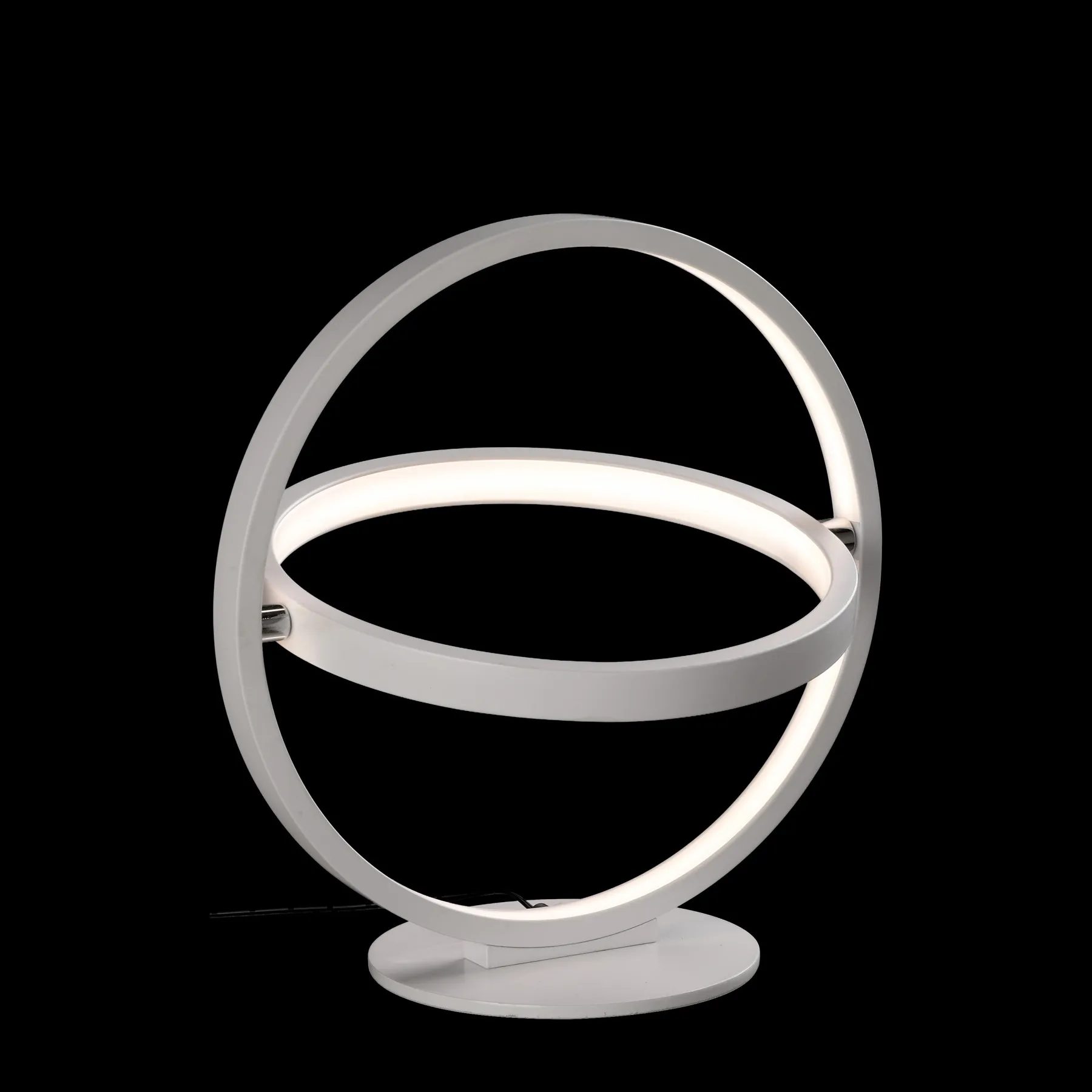 Встроенные светодиоды размещены в акриловом диффузоре внутри каждого кольца, образуя световые обручи и придавая образ космичности и инновации. Регулируемые подвесные светильники доступны в трех размерах. коллекция также предлагает фиксированный потолочный светильник и настольную лампу.